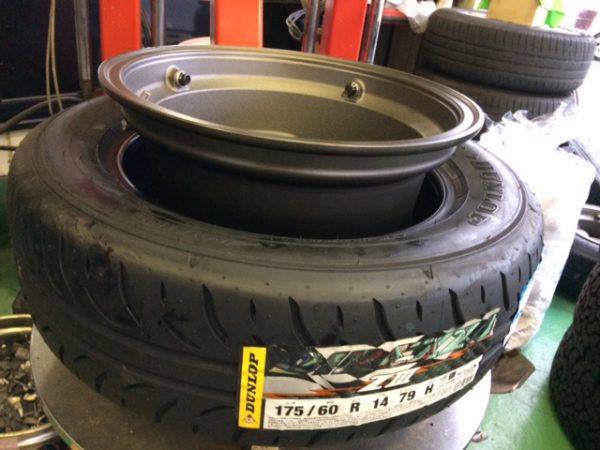 リア9JのアルミホイルにダンロップのセミレーシングタイヤDZZ3、175/60R14をぶっこみます